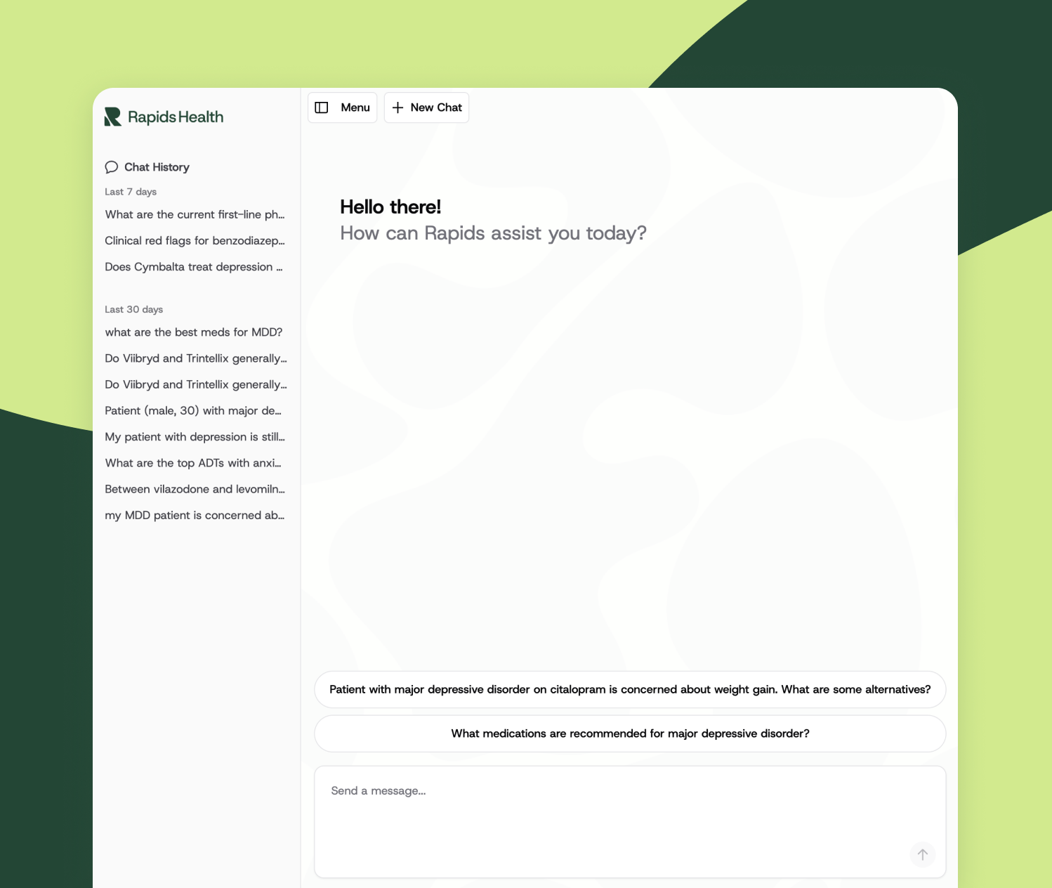 Rapids Assistant is an AI-powered clinical decision support tool that makes evidence-based and expert-informed psychiatric knowledge accessible instantly, safely, and in context, to support confident and informed clinical decision-making. Rapids Service is a clinical decision support service that provides evidence-based treatment and diagnostic guidance, personalized to the patient.